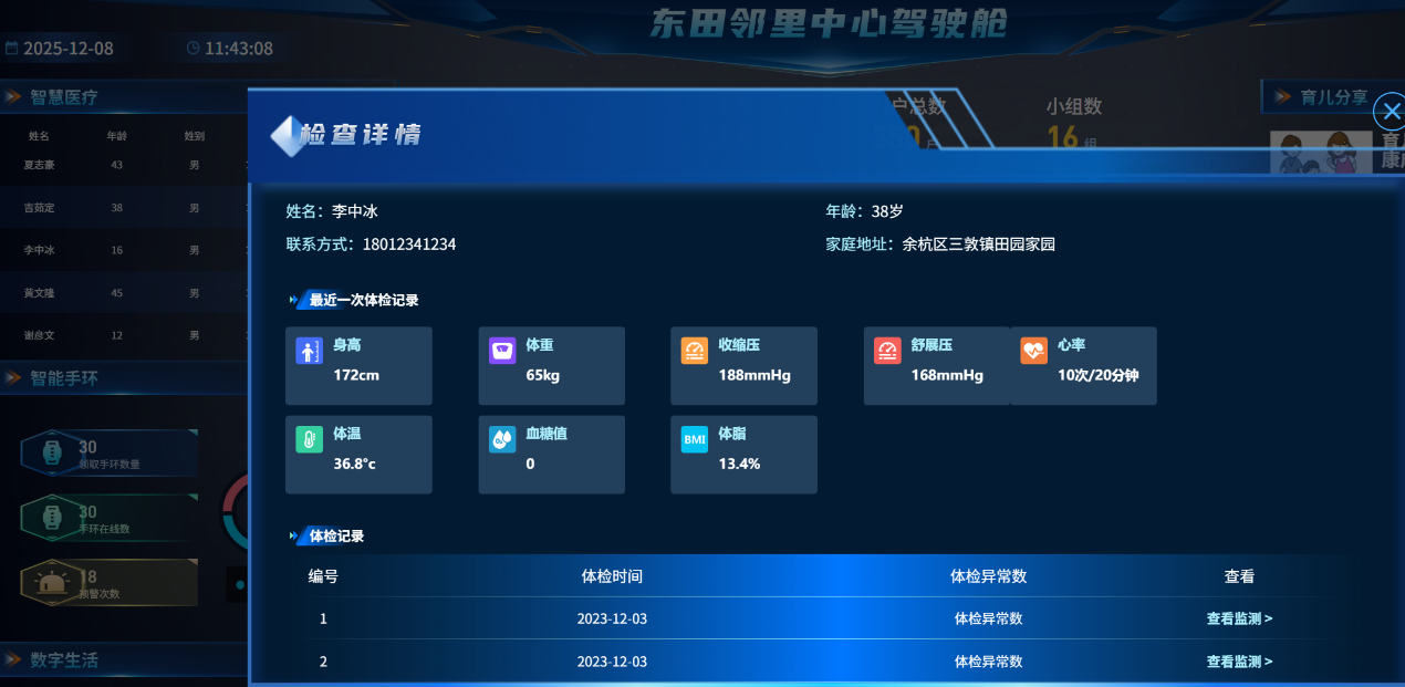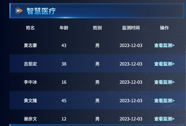 在该网站左上角的“智慧医疗”栏目中,列有林雅南、刘柏宏、夏志豪、吉茹定、李中冰、黄文隆、谢彦文、傅智翔、洪振霞、刘姿婷、荣姿康等人的所谓“健康监测信息”。若点击查询监测详情,均显示“李中冰”一人的信息,身高、体重、收缩压、心率、体温、血糖值、体脂等体检指标完全一致。